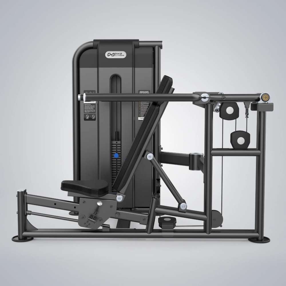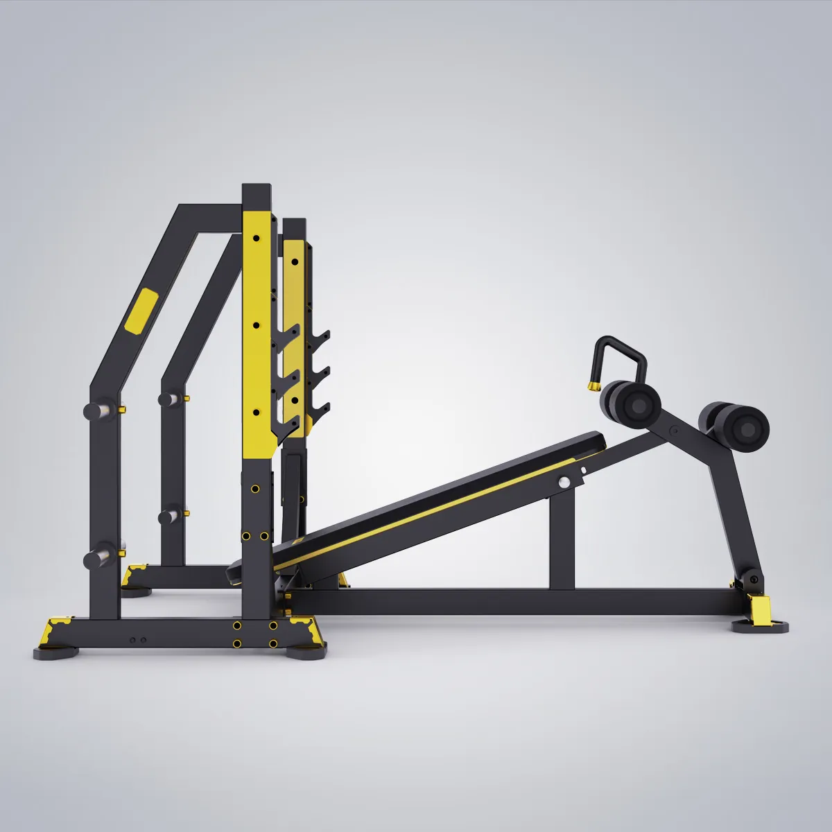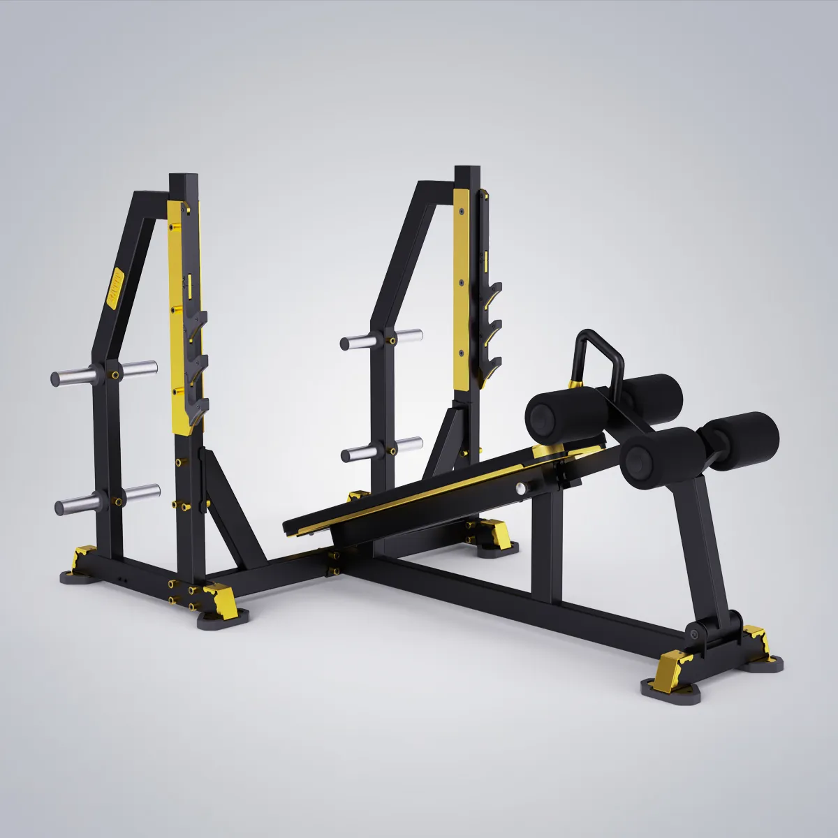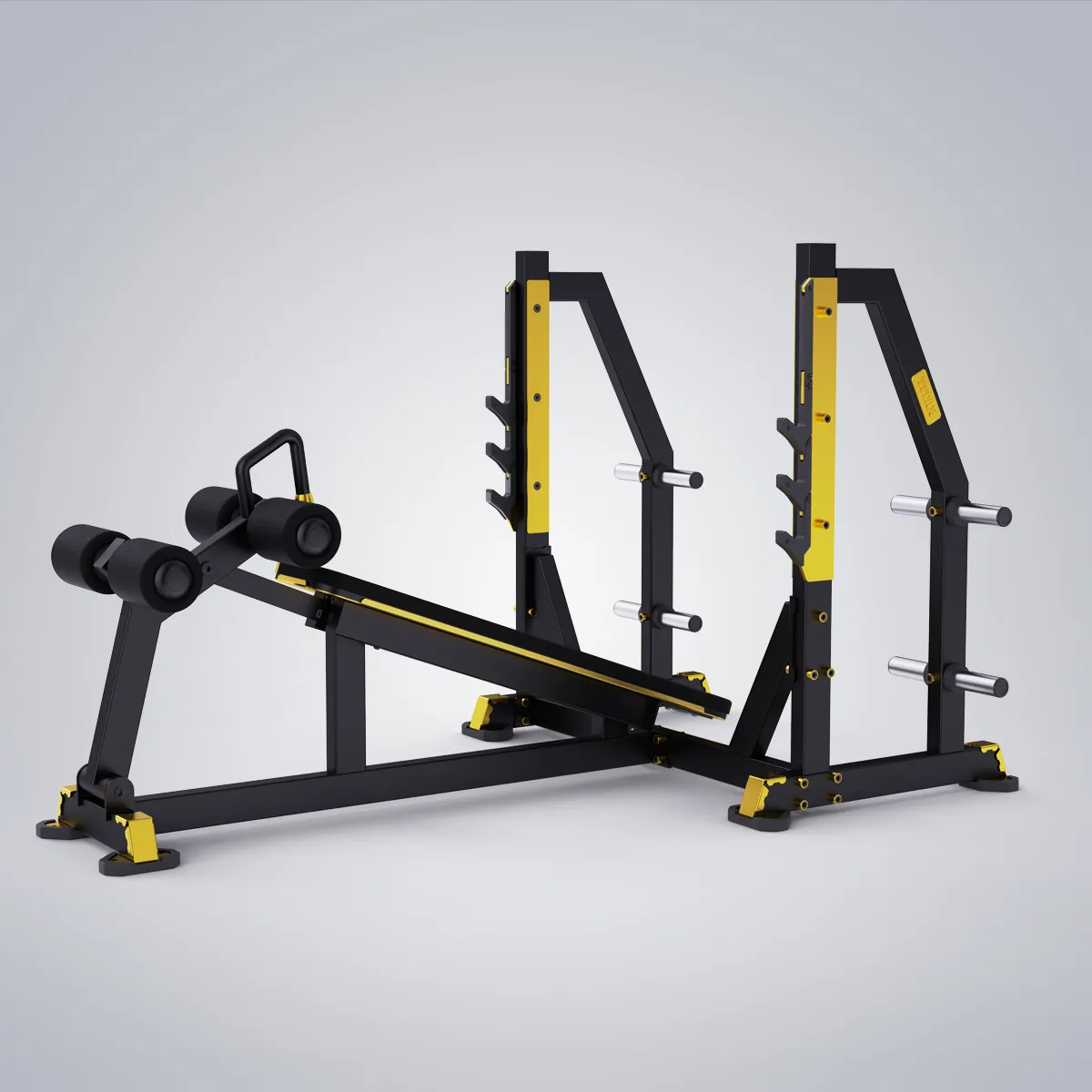 Banco declinado con cuatro soportes para barras y ocho soportes para discos.